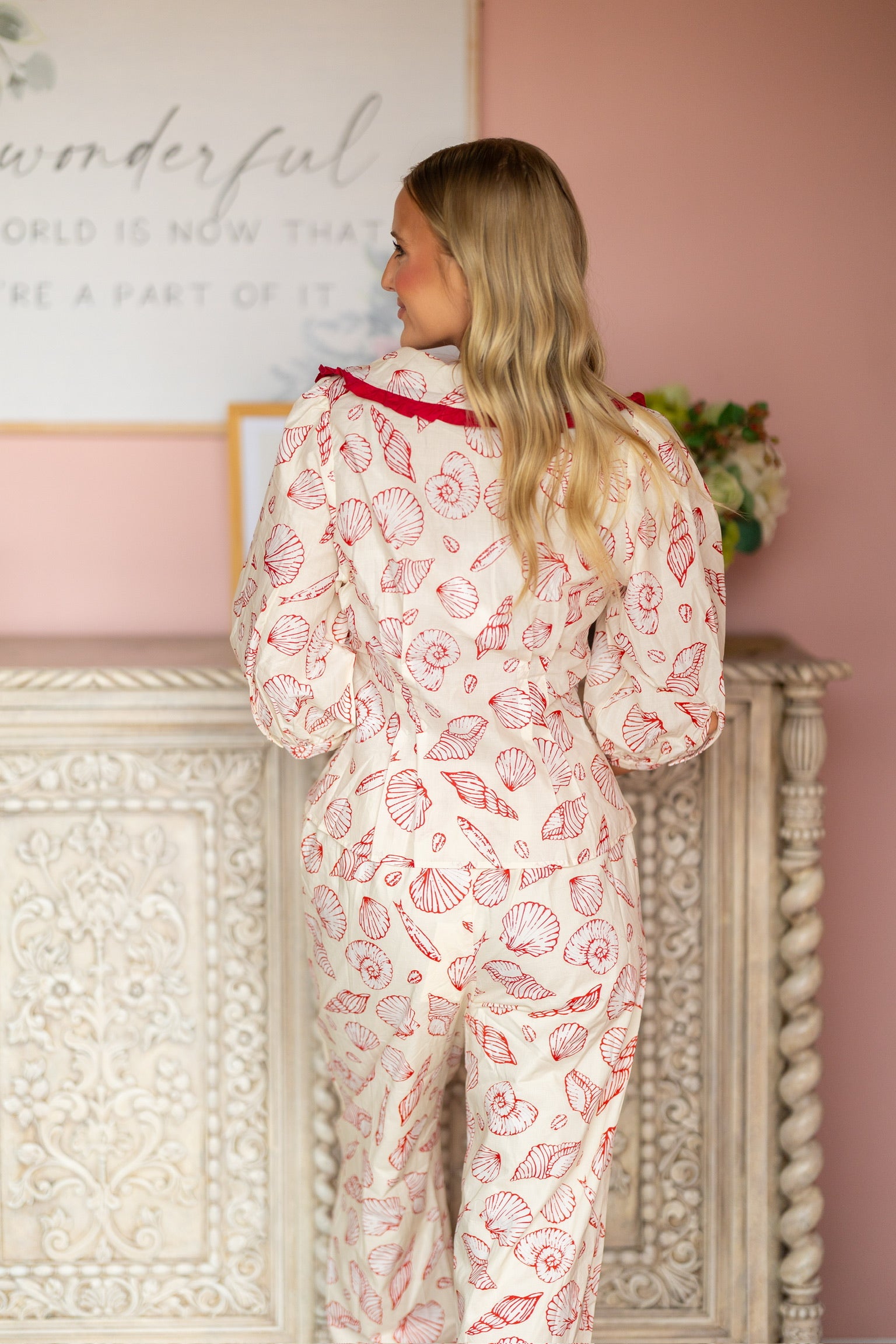 This set features a coordinated top and pants ensemble adorned with a playful red seashell print on a light cream background. The top includes voluminous half sleeves and a standout V-shaped collar trimmed with bold red ruffles, adding a whimsical, feminine touch. The pants are relaxed and high-waisted, offering both comfort and style with a matching shell motif throughout. The lightweight fabric and cohesive print make this look perfect for a beach vacation or a breezy summer day.