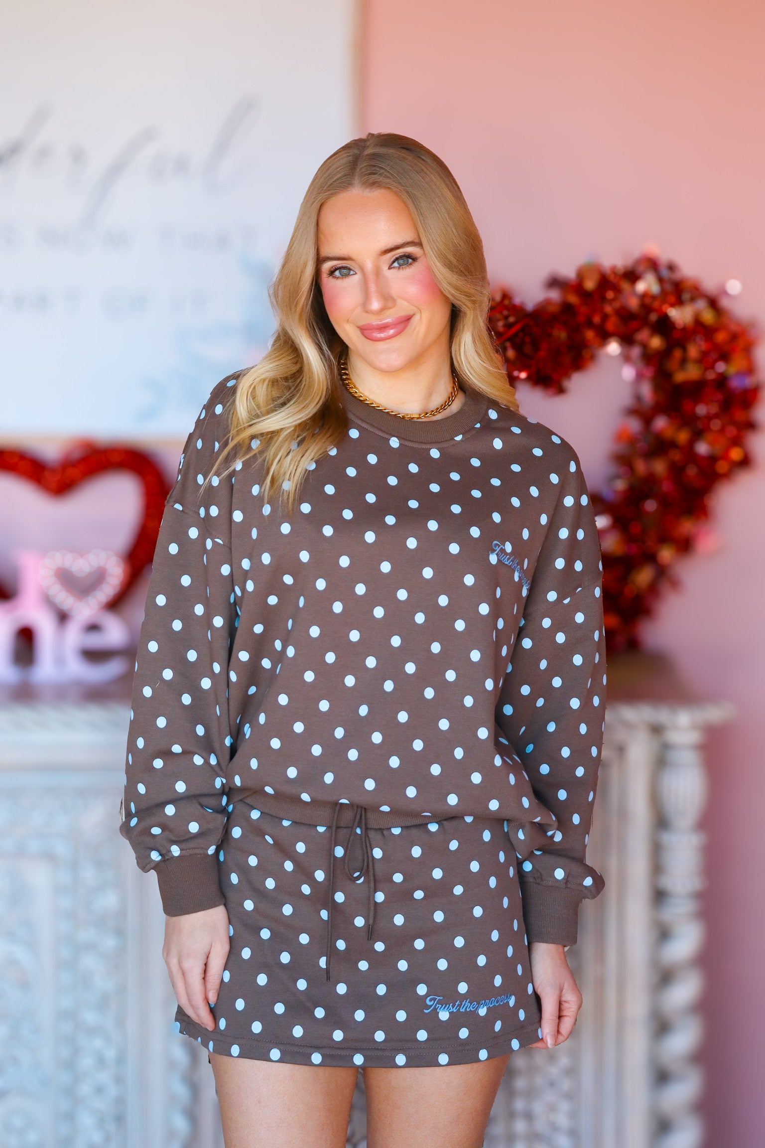 This cozy brown set with light blue polka dots is equal parts comfy and cute.The sweatshirt features the phrase “Trust the Process” for a positive, laid-back vibe, while the matching skirt has built-in shorts underneath for extra comfort and coverage. Perfect for lounging, running errands, or styling up for an effortlessly cool look.