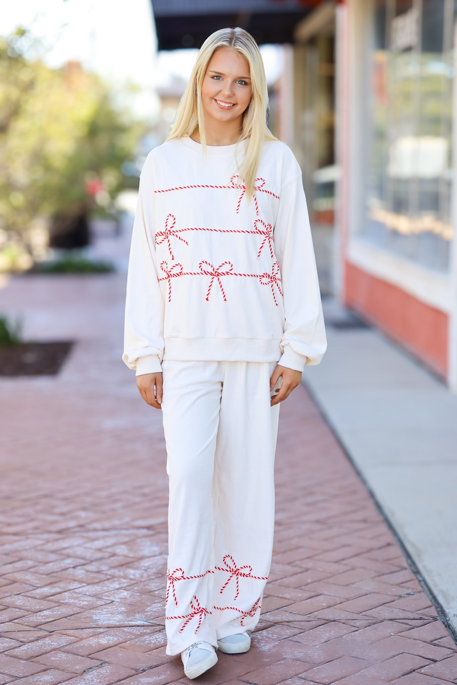This Twist Bow Crew Neck Sweat Set is the perfect blend of cozy comfort and girly charm. The top features a classic crew neckline with a relaxed, slightly oversized fit, elevated by a playful twist bow detail that adds a fun, feminine touch. The matching sweatpants are soft and easy to wear, designed with an elastic waistband and cuffed ankles for a laid-back yet polished look. Made from plush, midweight fabric, this set is ideal for lounging in style or running errands with a hint of flair — comfy, cute, and effortlessly chic.