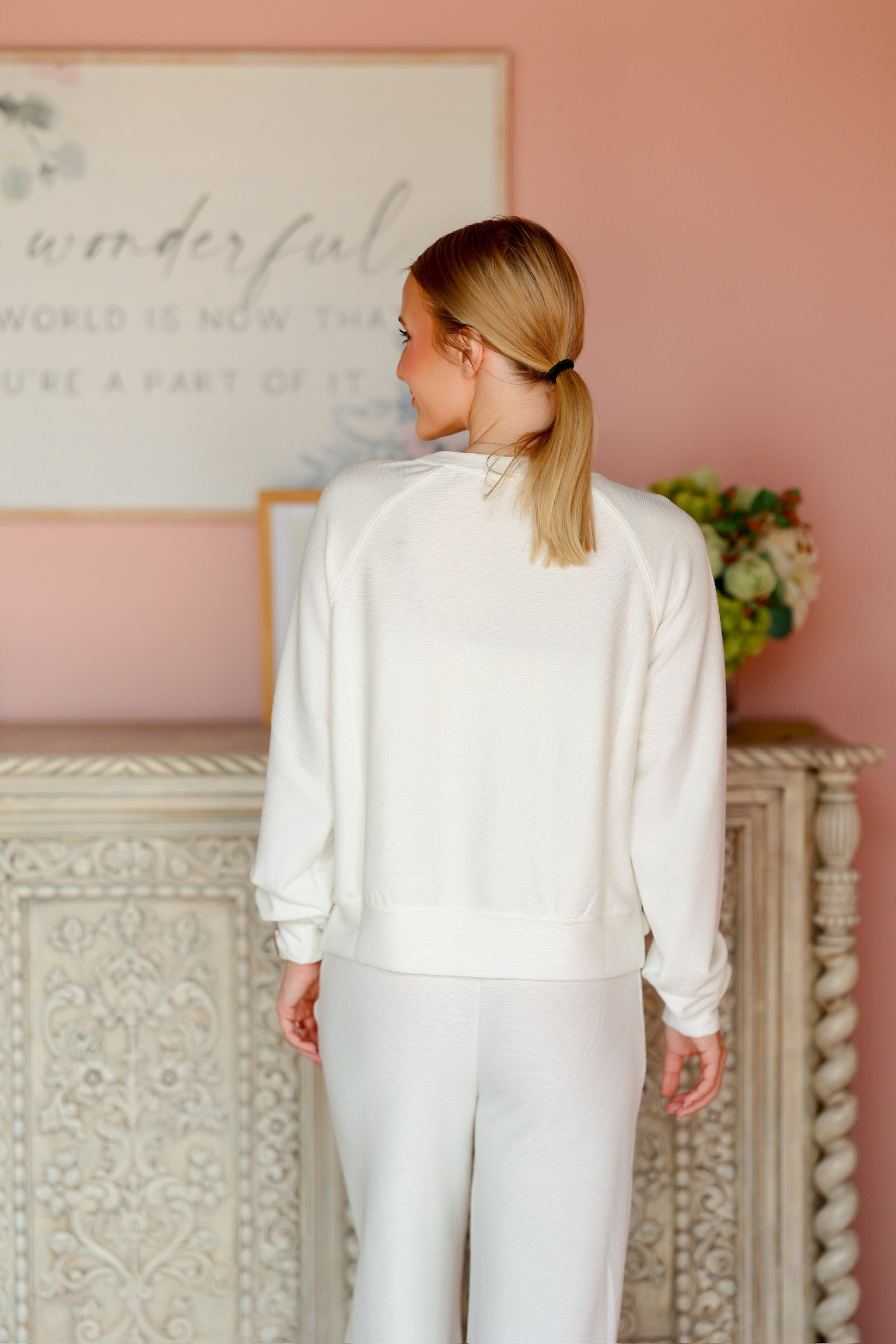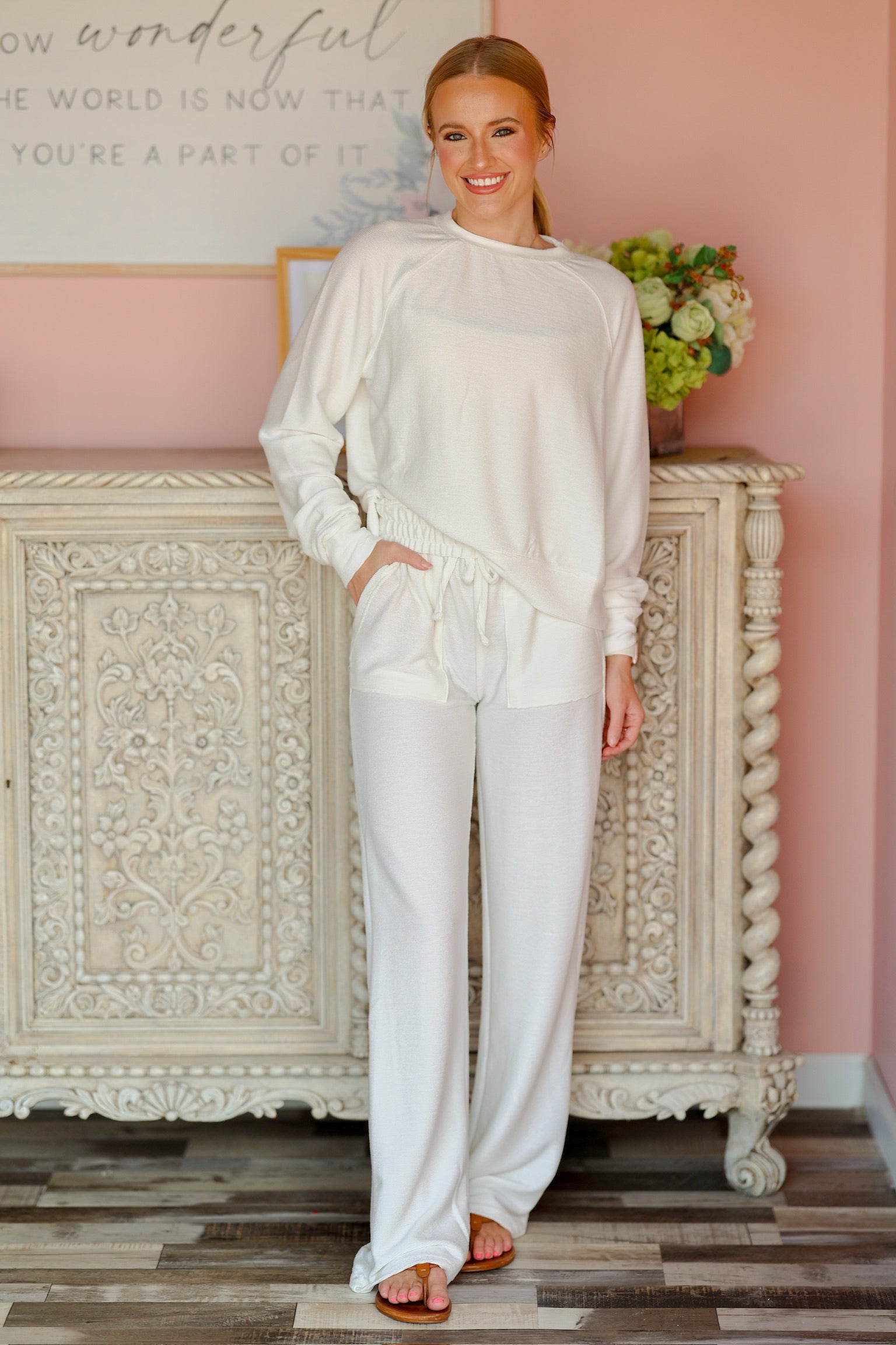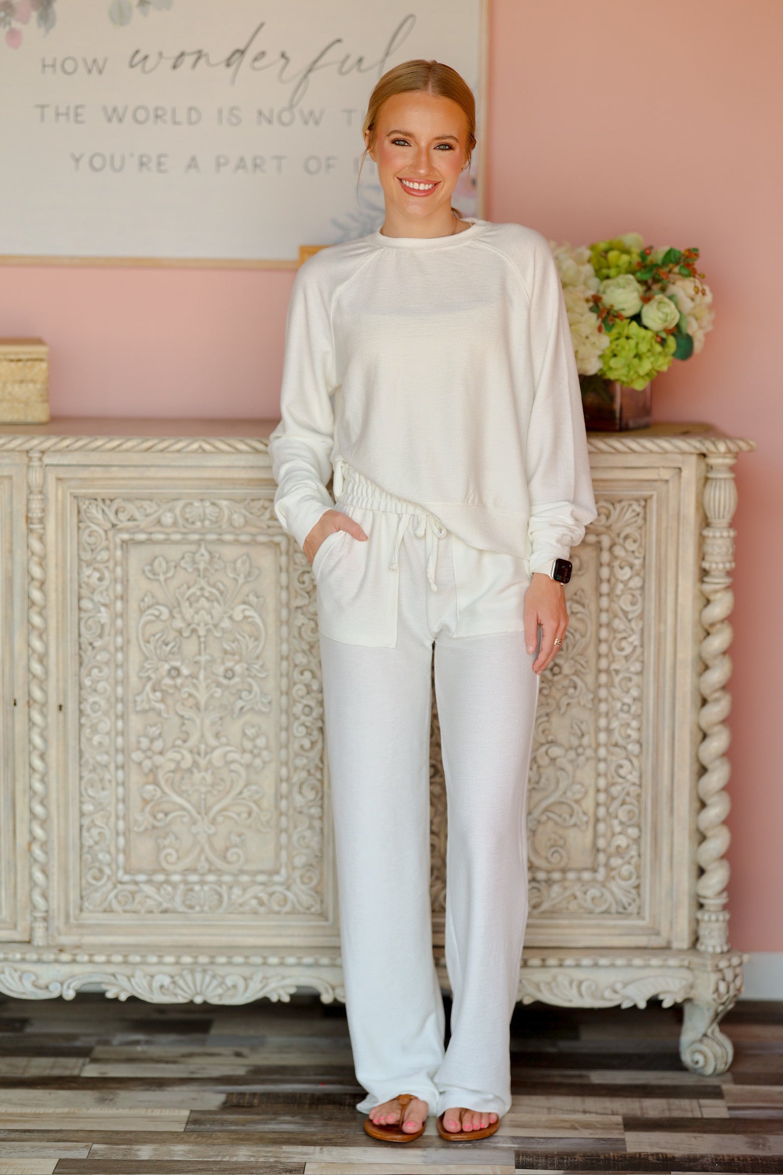 A chic and cozy white lounge set designed for both comfort and style. The soft, lightweight fabric offers all-day ease, while the matching top and bottoms create a polished, put-together look. Perfect for lounging at home, running errands, or casual outings, this set is a must-have staple for effortless everyday wear.