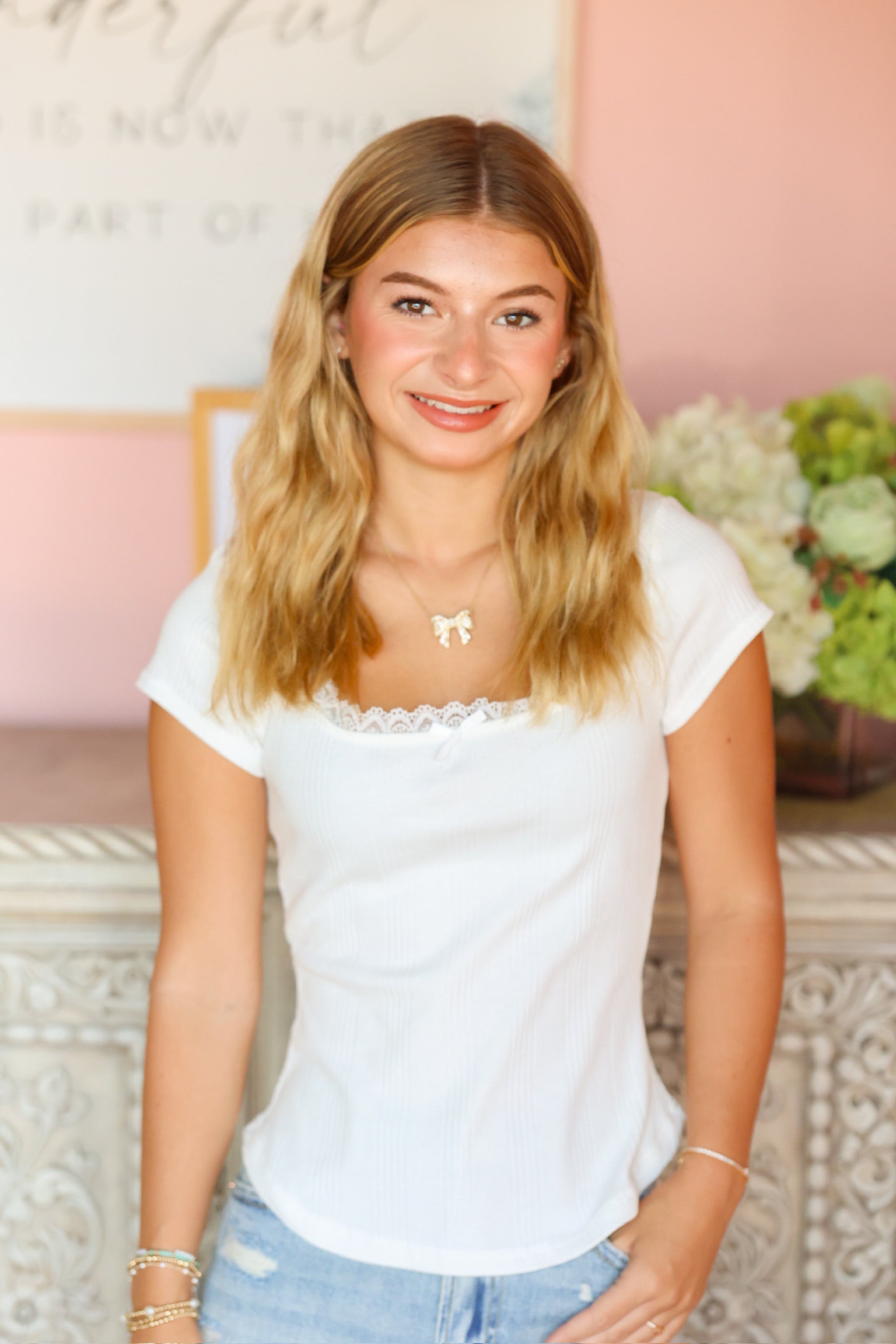 This white lace trim top is the perfect blend of sweet and chic. Made from a soft, lightweight fabric, it features delicate lace detailing along the neckline and hem for a feminine touch. The flattering fit makes it easy to dress up or down—pair it with denim for a casual look or layer it under a blazer for something more polished. Its timeless style and romantic accents make it a versatile closet staple