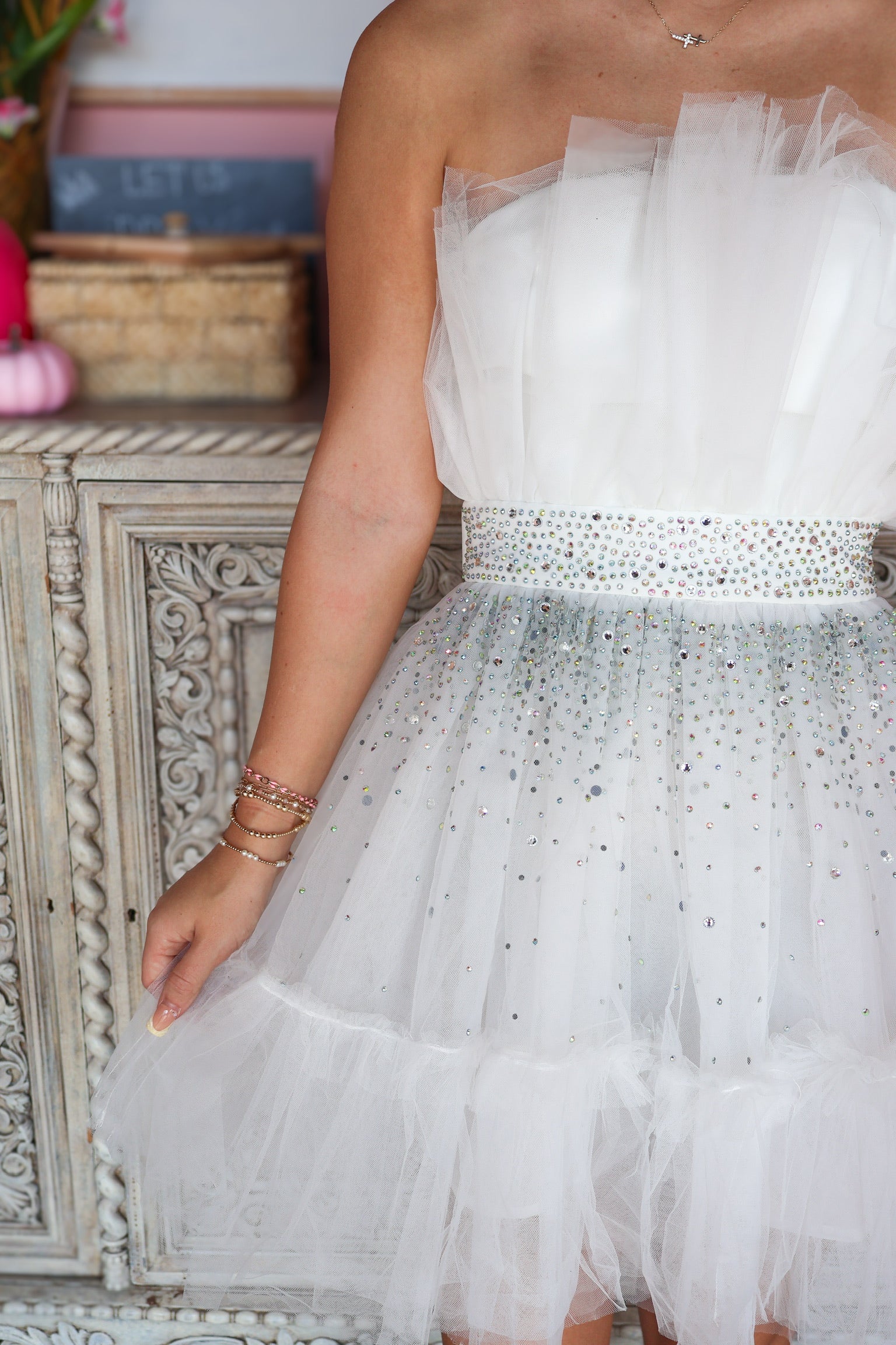 This white strapless tulle rhinestone dress is a dreamy and elegant showstopper. It features a structured, strapless neckline that flatters the shoulders and neckline, paired with layers of soft, airy tulle for a romantic silhouette. Sparkling rhinestones are delicately scattered throughout, adding the perfect touch of shimmer and sophistication. The mini length gives it a flirty, modern edge, making it the perfect choice for parties, celebrations, or any occasion where you want to shine.